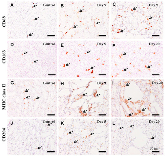 Immunohistochemistry for CD68 (A–C), CD163 (D–F), MHC class II (G–I), and CD204 (J–L) in the control and CDDP-treated kidneys. A few CD68+ macrophages (arrows) are seen in the corticomedullary junction of control kidneys (A), whereas many macrophages reacting CD68 (arrows) are present around the affected renal tubules on days 5 (B) and 9 (C). In contrast to control (D), many CD163+ macrophages (arrows) are seen on days 5 (E) and 20 (F). Increased numbers of MHC class II+ macrophages (arrows) are seen exclusively around the affected renal tubules on days 9 (H) and 20 (I), in contrast to control (G). Only a few CD204+ macrophages are present in the control (J) and on day 20 (L), whereas, on day 5, CD204+ macrophages are increased (K). Note that there are differences in the distribution and location of these macrophages from each other. Counterstained with hematoxylin. Bar = 50 µm.
