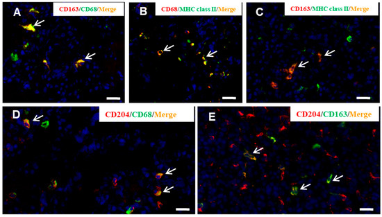 Double immunofluorescence for CD163/CD68 (A), CD68/MHC class II (B), CD168/MHC class II (C), CD68/CD204 (D), and CD163/CD204 (E) in CDDP-induced renal lesions on day 9. Yellow color (arrows) indicates double-positive reactions. Blue indicates nuclei stained with 4′,6-diamino-2-phenylindole (DAPI). Bar = 20 µm.