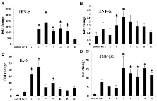 mRNAs of IFN-γ (Figure 7A) and TNF-α (Figure 7B) significantly increased on days 5 to 15 and on days 5 and 7, respectively. IL-6 mRNA (Figure 7C) increased earlier than that of IFN-γ and TNF-α; the expression significantly increased on days 3, 5 and 9. TGF-β1 mRNA significantly increased on days 7 to 20 (Figure 7D). mRNAs of IL-10 and IL-4 did not show any significant changes.
