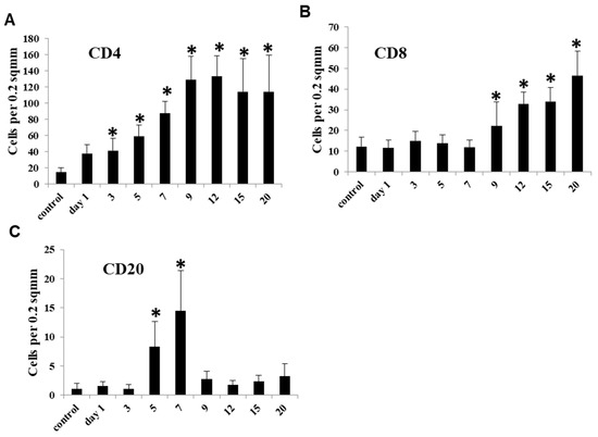 The number of lymphocytes reacting to CD4 (A), CD8 (B) and CD20 (C) in the control and CDDP-treated kidneys on days 1–20. Note that the kinetics of these lymphocytes to controls differs from each other. Dunnett’s test, *, significantly different from controls at p < 0.05.