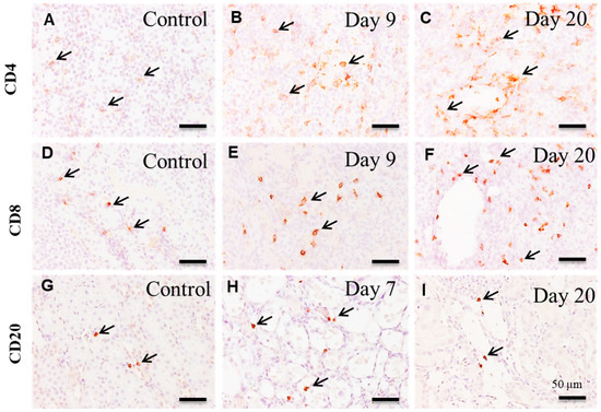 There were a small number of CD20+ B cells in the control and affected kidneys on days 1 and 3 (Figure 8C and Figure 9G). On days 5 and 7, the number of CD20+ B cells was significantly increased, showing a transient increase (Figure 8C and Figure 9H); however, the positive cell number was much less than that of CD4+ and CD8+ T cells. Thereafter, CD20+ B cells were suddenly decreased to control levels on day 9 onwards (Figure 8C and Figure 9I).