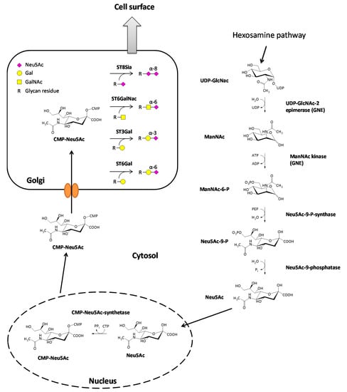 The synthesis of sialic acids starts with the epimerization of UDP-GlcNAc, leading to the formation of N-acetylmannosamine (ManNAc) through cleavage of the UDP nucleotide unit of the molecule. Immediately afterward, a γ-phosphate group of an ATP is transferred to the ManNAc in a kinase reaction resulting in ManNAc-6-phosphate and ADP [3]. Further downstream, ManNAc-6-phosphate reacts with phosphoenolpyruvate (PEP), derived from glycolysis, in an aldol addition to Neu5Ac-9-phosphat [9]. The reaction is catalyzed by the Neu5Ac-9-phosphate-synthase and energetically driven by the release of the phosphate group of the PEP. This reaction is followed by the cleavage of the phosphate group on the C9-position of the amino sugar catalyzed by the Neu5Ac-9-phosphatase resulting in the formation of N-acetylneuraminic acid (Neu5Ac). The final step of the sialic acid synthesis is the formation of CMP-Neu5Ac in the nucleus of the cell by the CMP-Neu5Ac-synthetase [10]. Almost all mammalian species can also synthesize N-glycolylneuraminic acid (Neu5Gc) from CMP-Neu5Ac. One exception are humans because they have a loss of function mutation in the enzyme converting CMP-Neu5Ac to CMP-Neu5Gc [11]. However, Neu5Gc taken up by dietary sources can be incorporated in human cells and is accumulated in some cancer types [12]. Nevertheless, the amount of Neu5Ac is relatively low, and Neu5Ac is the most common sialic acid in humans. From the nucleus, CMP-Neu5Ac is transported to the Golgi apparatus, passing its membrane through specific carrier proteins. Once located in the lumen of the Golgi, CMP-Neu5Ac then serves as a substrate for various sialyltransferases [13]. The sialic acid biosynthesis is illustrated in Figure 1.