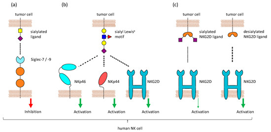 The inhibitory receptors Siglec-7 and Siglec-9 on NK cells can bind to sialic acid structure and help to recognize healthy cells, but sialylated tumor cells can exploit this mechanism to be protected against NK cell-mediated killing (Figure 2a). Therefore, the hypersialylation of cancerous cells and their interaction with Siglecs on NK cells might be a good target for cancer treatment. This could be achieved by enzymatic desialylation of tumor cells, blocking of Siglec-binding, or inhibition of sialyltransferase activity (reviewed by Daly et al. [103]). Because ligands for Siglec-7 and Siglec-9 are highly expressed on different tumor entities, Siglec-7/9-based chimera constructs have been tested for the use in chimeric antigen receptor (CAR)-T cell therapy in a recent study. The modified T cells could show promising anti-tumor activity in vitro and in vivo and might be a tool to target highly sialylated tumors [95].