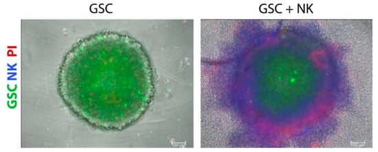Considering the importance of targeting therapy-resistant and tumorigenic CSCs, 3D models of CSCs incorporate the cellular heterogeneity of tumors, improve drug response predictability, and represent better models for discovering new targets for anticancer drugs compared to traditional 2D tumor cell lines []. GSC tumorspheres represent models generated by the symmetric and asymmetric division of patient-derived GSCs in a defined medium supplemented with growth factors, i.e., epidermal growth factor (EGF), fibroblast growth factor (FGF)-2, and neuronal viability supplement B27 []. These factors and the absence of serum are needed to maintain self-renewal and proliferation and to preserve the genetic characteristics observed in patients’ samples. Tumorspheres are characterized by an external proliferating zone, intermediate quiescent zone, and an inner necrotic core [], observed at a certain distance from the presence of nutrients, metabolites, and oxygen, resembling the necrotic areas of in vivo glioblastoma []. Tumor cells within tumorspheres closely interact with each other, thus reproducing the physical communication and signaling pathways that affect proliferation, survival, and response to therapy in vivo [] and forming a physical barrier that prevents and limits the transport of drugs into the tumorsphere mass []. Although a better model than monolayer cultures, tumorspheres represent random aggregations of cells that do not organize into tissue-like structures and also lack extracellular matrix []. The greater limitation of these models is the lack of neighboring non-tumor cells, i.e., stromal cells, including astrocytes, neurons, endothelial cells, mesenchymal stem cells, brain-resident microglia, and infiltrated peripheral immune cells; this altogether prevents studying their interactions with GSCs in vitro. Tumorspheres can be optimized by co-culturing cancer and stromal cells in so-called heterotypic spheroids, especially for testing cancer immunotherapeutic agents. For example, GSC tumorspheres were used to evaluate the penetration and cytotoxicity of highly cytotoxic super-charged NK cells (Figure 1, our results), grown in the presence of osteoclasts and probiotic bacteria to stimulate their cytotoxic potential towards CSCs []. In the study of Cheema et al. [], the authors used a murine GSC model in syngeneic immunocompetent mice to test a genetically engineered oncolytic herpes simplex virus that is armed with the cytokine interleukin 12 (G47∆-mIL12). In addition to targeting GSCs, oncolytic virus treatment increased IFN-γ release, inhibited angiogenesis, and reduced the number of Tregs in the tumor.