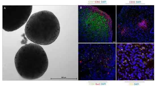 Organoids are becoming a very useful platform for cancer research, especially in the field of immuno-oncology; however, organoid establishment and its (pre)clinical applications are still immature. To date, co-cultures of epithelial tumor organoids and additional cellular components have been used to include the interactions between tumor and immune cells and have thus established a better preclinical model for immunotherapy. Immunocompetent organoids can be achieved by adding pre-treated autologous or allogeneic peripheral blood mononuclear cells (PBMCs) or specific immune cell populations, such as TAMs and tumor-infiltrating lymphocytes []. For example, in a recent study, Dijkstra et al. [] enriched tumor-reactive T cells by co-culturing PBMCs and tumor organoids from colorectal and non-small-cell lung cancer and demonstrated that these T cells can be used to assess the efficiency of killing tumor organoids. In another study, gamma delta 2 (γδ2)+ T cells were co-cultured with organoids from human breast epithelia, and these lymphocytes effectively eliminated triple-negative breast cancer cells []. These and other studies demonstrate that T cells can be obtained and activated by organoids for adoptive T cell therapy. Using the air-liquid interface technique, Neal et al. [] generated patient-derived organoids from different surgically resected primary and metastatic tumors with native embedded immune cells (CD8+ and CD4+ T cells, B cells, NK cells, and macrophages). This demonstrated the potential of organoids as tools to predict clinical responses to immune checkpoint therapies. For this method, tumor tissue fragments are embedded in a type I collagen matrix on an inner Transwell insert. Culture medium with different supplements is added to the outer dish to diffuse via the permeable membrane. The collagen layer is exposed to air to ensure oxygen supplies for the long-term preservation of organoids []. The latter approach is very promising and can also be applied for future glioblastoma research. In a recent study, the specific oncolytic activity of Zika virus against GSCs in glioblastoma cerebral organoids was demonstrated. The authors showed that SOX2 and integrin αvβ5 represent key markers for Zika virus infection in association with suppression of immune response genes. Thus, Zika virus infection provides the possibility for brain tumor therapy []. The organoids established by Jacob et al. [] are the first that, besides tumor cells, also include the TME. As CAR T cells represent a powerful new approach to treat glioblastoma, these glioblastoma organoids, which preserve the immune microenvironment and other stromal cells, were used as a model. The authors demonstrated that this rapid protocol for organoid generation provides a platform to test and optimize CAR T therapies for tumors of non-epithelial origin and enables a personalized treatment approach. We also showed that organoids established by this protocol after 4 weeks in culture included GSCs, differentiated glioblastoma cells, tumor vasculature, and immune cells, such as macrophages, microglia, and T cells (Figure 2, our results).
