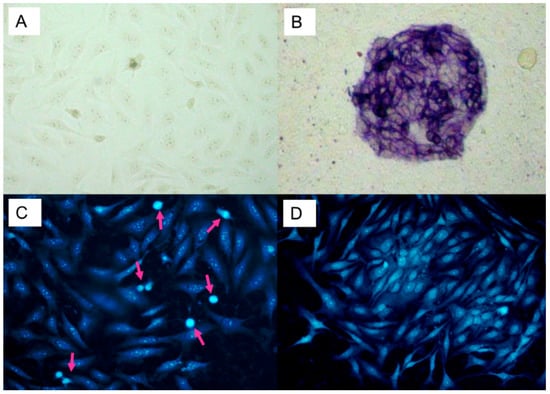 DAPI staining of differentiated and undifferentiated HOS are presented in Figure 1C,D. Undifferentiated HOS cell cultures (Figure 1C) had high numbers of mitotic cells and presence of these cells is indicated by pink arrows, while differentiated HOS cell cultures had low numbers of mitotic cells. Differentiated and undifferentiated HOS cells are different (Table 1) with respect to the number of alkaline phosphatase positive nodules in cell culture (p < 0.0002), mitosis (p < 0.001), and 3H-thymidine incorporation (p < 0.05). Apoptotic cells were not detected in either of the cell cultures.