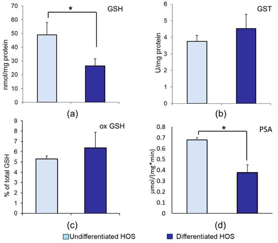 Antioxidative parameters in differentiated and undifferentiated HOS, indicating ability to reduce HNE damage: (a) GSH; (b) GST activity; (c) ox GSH; (d) proteasomal activity (PSA). Difference according to t-test significant between two cultures, * p < 0.05.