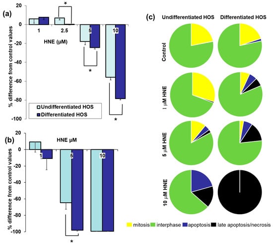 Cell viability of HOS treated with different concentrations of HNE is presented in Figure 3A. Low concentrations of HNE (1 µM, 2.5 µM) did not show differences when compared to control, untreated cells (p > 0.05), while higher concentrations of HNE (5 µM, 10 µM) significantly decreased viability in both, undifferentiated and differentiated HOS cells (p < 0.05). While there was no difference between viability of differentiated and undifferentiated HOS treated with 1 µM HNE, differentiated HOS had significantly lower viability when treated with 2.5 µM, 5 µM, and 10 µM HNE (p < 0.05).