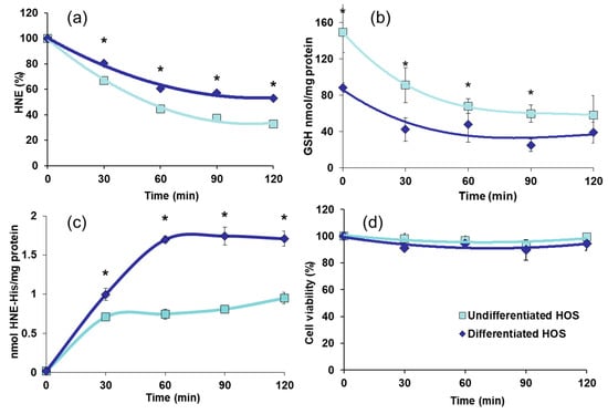 Treatment of undifferentiated and differentiated HOS with HNE (20 nmol/106 cells). (a) elimination of HNE from the media; (b) content of GSH in cells treated with HNE; (c) amount of HNE-protein adducts in cell cultures treated with HNE; (d) cell viability checked through the time of experiment upon trypan blue exclusion assay. Difference according to t-test significant between two cultures, * p < 0.05.
