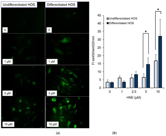 Induction of ROS in cell cultures treated with HNE. (a) Green fluorescence as a measure of ROS in differentiated and undifferentiated HOS treated with HNE; (b) fluorescence intensity in undifferentiated and differentiated HOS analyzed by t-test, * p < 0.05.