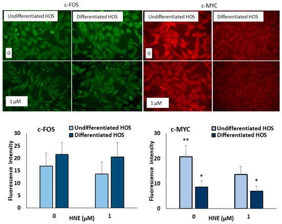Representative immunofluorescence labeling for c-FOS and c-MYC in differentiated and undifferentiated HOS. Difference according to t-test significant between two cultures, * p < 0.05; and 0 and 1 µM HNE, ** p < 0.05.