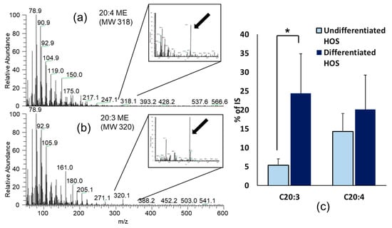 Fatty acid analyses. (a) Arachidonic acid, 20:4 (MW 318) and (b) mead acid 20:3, (MW 320); (c) amounts of 20:3 and 20:4 in undifferentiated and differentiated HOS normalized with internal standard. Amount of C20:3 was different between cultures, * p < 0.05.