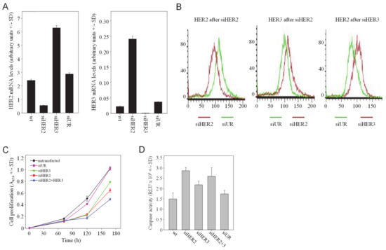 HER single knockdown leads to the counter-upregulation of the respective other HER family member, and combined HER2/HER3 knockdown leads to enhanced antitumor effects. (A) SKOV3 cells were transfected with siRNAs as indicated in the figures and analyzed for mRNA levels of HER2 (left) and HER3 (right). (B) Alterations of HER2 and HER3 protein levels, as determined by flow cytometry. (C) Anti-proliferative and (D) pro-apoptotic effects upon siRNA-mediated single or double knockdown of HER2 and/or HER3.