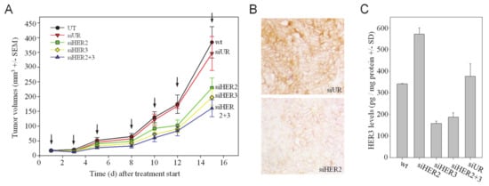 To test whether the HER2 + HER3 double knockdown also leads to more profound antitumor effects in a therapeutic setting in vivo, mice bearing s.c. tumor xenografts were treated with an RNAi therapy protocol. More specifically, siRNAs were complexed with polyethylenimine (PEI) for the formation of polymeric nanoparticles mediating siRNA protection, cellular uptake and intracellular release as described previously [31,37]. Upon establishment of tumors from s.c.-injected SKOV3 wildtype cells, mice were treated three times per week by intraperitoneal injection of 10 μg PEI-complexed specific (siHER2, siHER3) or non-specific (siUR) siRNAs, or left untreated (UT). The monitoring of tumor sizes revealed a ~30–40% reduction of tumor growth upon single knockdown of HER2 or HER3, respectively (Figure 2A). The combined treatment with siHER2 + siHER3 exerted a more profound effect with a ~50% reduction of tumor growth. In this experimental setting, it was not possible to determine a survival advantage after specific treatment since the study was terminated for all mice at the same time point.