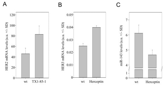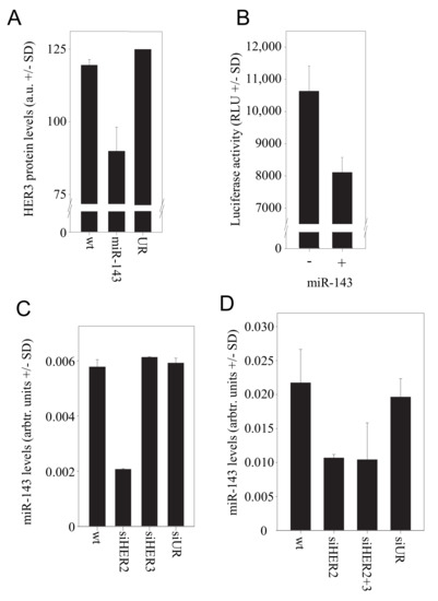 MicroRNAs have been recognized as important regulators of gene expression, acting on their target mRNA through translational repression or mRNA degradation. Simultaneously, miRNAs are often differentially expressed e.g., in normal vs. pathological tissues including tumors, which allows their use as biomarkers and has been shown to be of functional relevance. Previously, the expression of several miRNAs has been associated with HER2 receptor status, including miR-143, which is significantly upregulated in HER2-negative vs. HER2-positive tumors [38] and is considered as tumor-suppressing miRNA frequently downregulated in tumors (see e.g., [35,39]). In silico analysis by target scan (www.targetscan.org) identified HER3 as one target for miR-143, prompting us to analyse the possible role of miR-143 in the HER2/HER3 interplay in more detail.