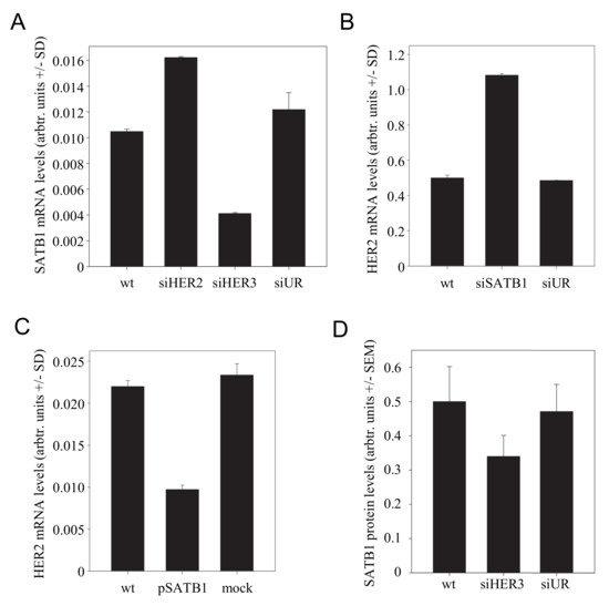 The chromatin organiser and transcriptional regulator “Special AT-rich binding protein 1” (SATB1) has been shown to be expressed during tumorigenesis and to affect the gene expression profile of breast cancer cells [40]. It supports an aggressive phenotype and promotes tumor growth and metastasis in various tumor entities (see [41] for review). Previously, functional profiling had revealed that HER receptors can be regulated by SATB1, with results, however, being dependent on the cell line [40]. We thus hypothesized that SATB1 may be involved in the mutual regulation of HER receptor expression. Notably, when we analyzed SKOV3 cells after HER3 knockdown, a marked >60% downregulation of SATB1 was observed (Figure 4A). This SATB1 inhibition led in turn to the induction of HER2 expression, as demonstrated by a >2-fold increase in HER2 mRNA levels upon siRNA-mediated SATB1 knockdown (Figure 4B). We confirmed this finding in the reverse experiment by SATB1 overexpression, which led to reduced HER2 levels (Figure 4C). No SATB1 effect was observed on HER3 expression. Taken together, this establishes a connection specifically between HER3 and HER2.