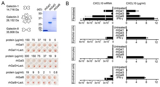 Galectins induce CXCL10 in a cell type-specific manner. (A) SDS-polyacrylamide gel electrophoresis of recombinant human galectins (rhGal) stained with Coomassie Blue. Molecular weights of protein standards are indicated on the left. The hemagglutination assay was performed using serial two-fold dilutions of the recombinant protein. The bottom row contains protein incubated with β-lactose, a competitive carbohydrate inhibitor of galectin binding. (B) Cultures of human corneal fibroblasts, human corneal epithelial cells, THP-1 monocytes and human umbilical vein endothelial cells (HUVECs) were incubated with 50 µg/mL rhGal-1, -3 and -8 or 50 µg/mL IFN-γ. Quantitative real-time PCR was used to determine the levels of CXCL10 mRNA after 6 h of incubation (n = 3 independent experiments), whereas ELISA was used to determine the levels of CXCL10 protein in cell culture supernatants after 24 h of incubation (n = 6 independent experiments). The data represent the mean ± SEM.