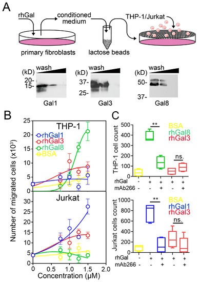 A major question raised by the present findings is how galectins contribute to the differential migration of THP-1 and Jurkat cells after induction of CXCL10. There are several potential explanations for our observation. Other than CXCL10, fibroblasts produce factors that condition the cellular and cytokine microenvironment [29]. Among them are matrix metalloproteinases that modify cytokines and chemokines and consequently affect leukocyte migration [30]. For instance, cell culture supernatants obtained from human cardiac fibroblasts contain MMP2 that degrades the CCL7 chemokine and impairs the chemotaxis of THP-1 monocytes [31]. Also, fibroblasts can express stimulatory signals that directly regulate the activation and differentiation of T cells and, consequently, their trafficking [32,33]. It is likely that members of the galectin family, by differentially affecting the expression of these other factors, intricately regulate the CXCL10-dependent migration of immune cells. Further experiments based on high throughput biological systems will be needed to unravel this complex regulatory network.