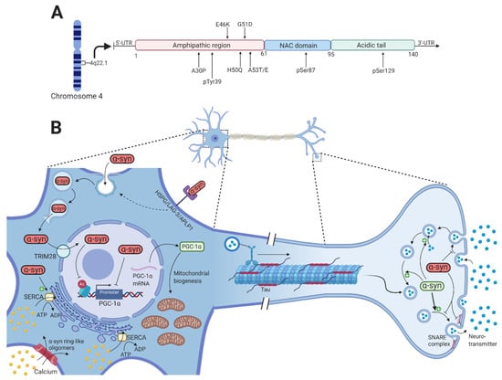 In its native conformation, -synuclein has been observed to exist as both monomers [] and tetramers, mediated by its KTKEGV repeats []. The PD-associated A53T and A30P mutations in -synuclein shift the native tetrameric conformation towards the monomeric conformation [], suggesting that the destabilization of the -helical tetramers and the increased number of unfolded monomers facilitate the aggregation-mediated pathology of -synuclein in PD. However, neurotoxic alterations in -synuclein that lead to the formation of oligomers and fibrils are mediated by missense mutations (A53T, A53E, A30P, E46K, H50Q, and G51D) in the SNCA gene [,,,,,,], gene dosage changes by whole-locus duplications or triplication [,], and PTMs of -synuclein that include phosphorylation of serine 87 (pSer87) and serine 129 (pSer129) [], oxidation, and nitration (Figure 1A) [].