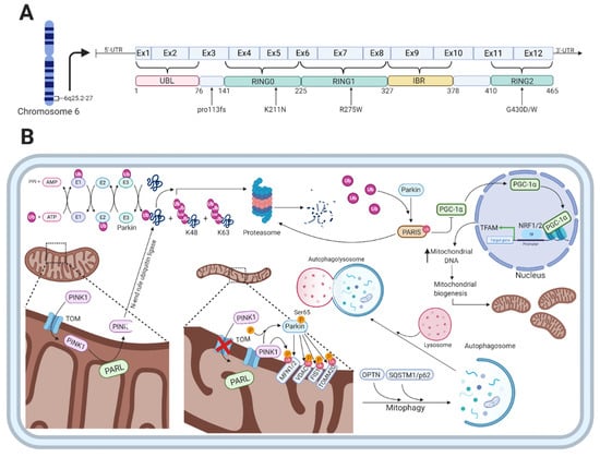 Twenty-two years have passed since Kitada et al. discovered in 1998 the causative parkin gene responsible for EOPD that was designated as PARK2 []. Since then, numerous research articles have been published to elucidate the molecular mechanisms underlying PARK2-related PD []. The pivotal role of parkin as an E3-ubiquitin ligase involves its function in the clearance of misfolded and aggregated proteins by the proteasome system [], its regulation of mitophagy [,] and mitochondrial biogenesis [] to prevent mitochondrial dysfunction, and its direct and indirect functions to prevent oxidative stress (Figure 2B) [,]. The molecular mechanisms underlying PARK2-related PD are complex and involve multiple processes that remain to be determined. Research is needed to understand the dysfunctional intracellular signaling processes as this will initiate the development of novel therapeutic treatments.