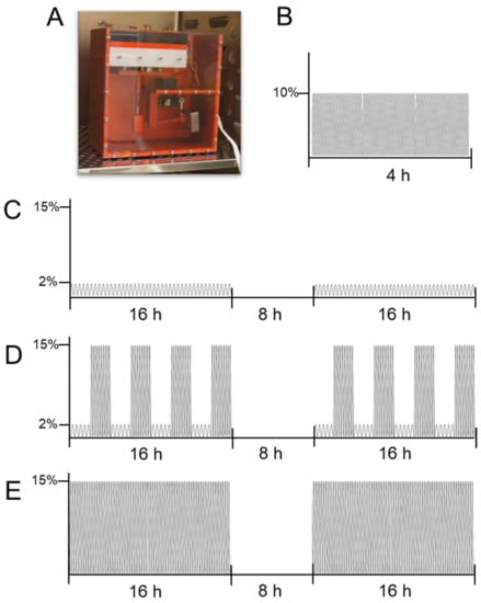The short high-frequency cyclic tension protocol was adapted from Muschter et al. [] consisting of two groups: The control group, representing cells incubated under cell culture conditions for a total of 28 h, and the cyclic tension group, representing cells preincubated for 24 h followed by the cyclic tensile strain of 10% by a frequency of 1 Hz for a duration of 4 h (Figure 2B).