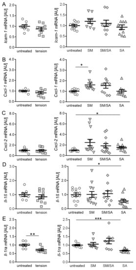 We first focused on genes involved in the immune cell recruitment and analysed the effects of various tensile protocols. The Icam-1 gene encodes for a cell surface glycoprotein, which is induced by cytokines and involved in leukocyte recruitment [,]. The gene expression of Icam-1 was neither affected by the short high-frequency tensile strain (p = 0.3031; Figure 3A) nor the prolonged tensile strain (SM: p = 0.3702; SM/SA: p = 0.9050; SA: p = 0.9316). Next, we investigated the gene expression of Cxcl-1 and Cxcl-2, which encode chemo-attractants for neutrophils and leukocytes. The gene expression of Cxcl-1 or Cxcl-2 was not affected by the short tensile strain protocol (Cxcl-1: p = 0.2024, Cxcl-2: p = 0.8681; Figure 3B,C). The prolonged moderate tensile strain (SM) increased the Cxcl-1 expression (p = 0.0432), while the intermediate (SM/SA: p = 0.2253) or advanced (SA: p > 0.9999) stretching had no impact on the Cxcl-1 gene expression (Figure 3B). In contrast, we detected no effects of moderate (SM: p = 0.1244) or intermediate (SM/SA: p = 0.2309) tensile loading, while advanced stretching (SA: p = 0.0315) increased the Cxcl-2 expression significantly (Figure 3C).
