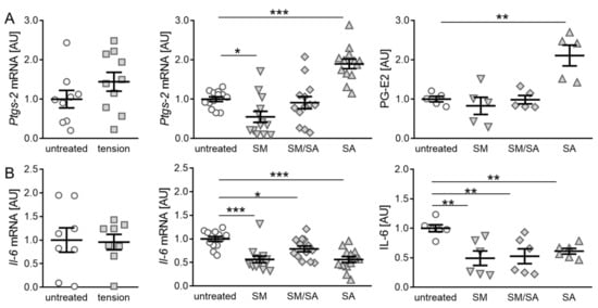 Synovial-fibroblast-mediated expression of inflammatory markers induced by various tensile loading protocols. Expression profiles of the inflammation indicator Ptgs-2, PG-E2 (A), and the inflammatory cytokine IL-6 (B) induced by the short high-frequency tensile strain or prolonged tensile strain, respectively. AU: Arbitrary units; SM: Moderate; SM/SA: Intermediate; SA: Advanced. n ≥ 5, * p ≤ 0.05, ** p ≤ 0.01, *** p ≤ 0.001.