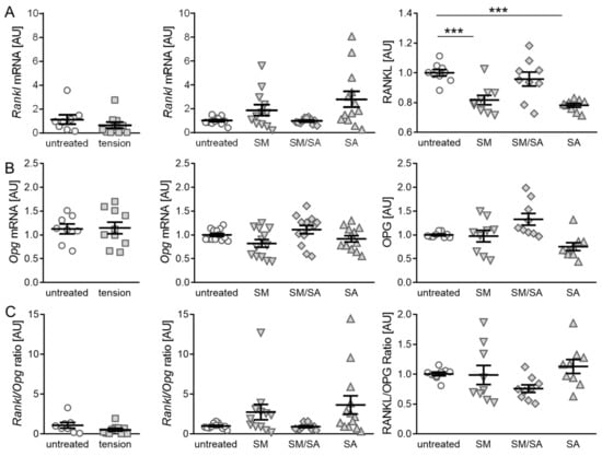 Synovial-fibroblast mediated expression of RANKL and OPG induced by various tensile loading protocols. The gene and protein expression of RANKL (A) and the corresponding decoy receptor OPG (B), as well as the RANKL/OPG ratio (C) after the short high-frequency tensile strain or prolonged tensile strain. AU: Arbitrary units; SM: Moderate; SM/SA: Intermediate; SA: Advanced. n ≥ 6; *** p ≤ 0.001.