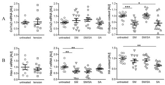 Synovial-fibroblast-mediated expression of matrix constituent products induced by various tensile loading protocols. Analysis of the gene expression profile of Col1a2 and soluble collagen components (A), and the gene expression of Has-1 and soluble glycosaminoglycan hyaluronan acid deposition (B) induced by the short high-frequency tensile strain or prolonged tensile strain, respectively. AU: Arbitrary units; SM: Moderate; SM/SA: Intermediate; SA: Advanced. n ≥ 6, * p ≤ 0.05, ** p ≤ 0.001, *** p ≤ 0.0001.