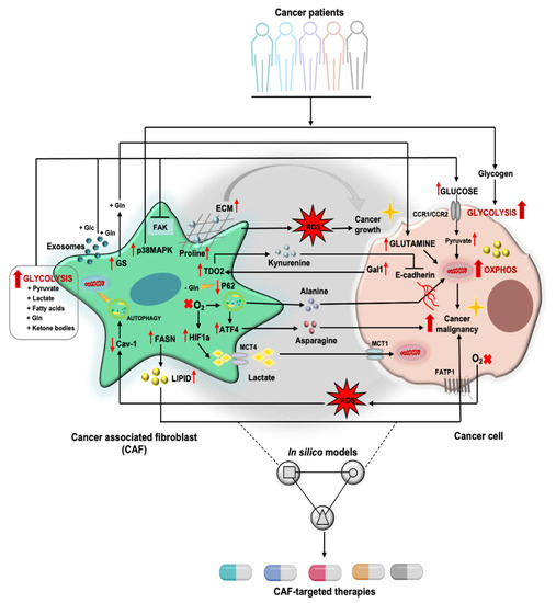 Thus, we focus in this review on our current understanding of the mechanisms underlying cancer cell–CAF metabolic interactions, which need further investigation in order to develop novel therapies. We discuss in detail, the activation of different metabolic pathways, which results from the interaction between tumor cells and CAFs. Distinct metabolic analyses on the tumor-CAF crosstalk, covering in vitro, in vivo and in silico modelling approaches, are described and critically evaluated. We present the idea of mapping the complex metabolic landscape of tumor cells and CAFs in order to reach mechanistic insights, by the integration of multi-omics data into context-specific metabolic models. Finally, we discuss the future development of therapeutic strategies considering metabolic targets identified in CAFs.