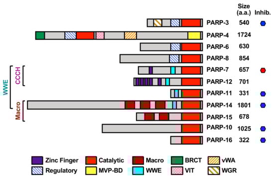 Structural and functional organization of mono(ADP-ribosyl) transferases (MARTs). Schematic representations of human MARTs depicting key structural and functional domains. The MARTs have been categorized based on the presence of CCCH zinc fingers, tryptophan-glutamate (WWE) motifs, and macrodomains in the proteins. The domains shown are MVP-BD (major vault protein-binding domain); BRCT (BRCA1 C-terminal domain); VIT (vault inter-trypsin domain); RRM (RNA Recognition Motif); WGR (tryptophan-glycine-arginine-rich domain); and vWA (von Willebrand factor type A domain). The MARTs that have known inhibitors (inhib.) are indicated with a hexagon (red = in clinical trials, blue not yet in clinical trials). Other non-cytosolic or non-MART members of the poly(ADP-ribosyl) polymerase (PARP) family are not shown: PARP-1, PARP-2, and PARP5a/b (nuclear polyenzymes); PARP-9 and PARP-13 (catalytically inactive). PARP-3 is a MART, but is primarily nuclear. The size of each protein (in amino acids, a.a.) is drawn to scale, but the position and size of the functional domains is approximate.