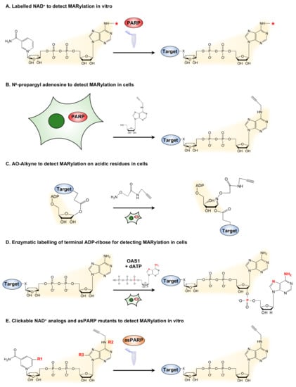 Since PARPs utilize NAD+ as a substrate and a source of ADPR, historic studies of (ADP-ribosyl)ation (ADPRylation) have used radioactively- or biotin-labelled NAD+ to visualize target modification (Figure 2A). By coupling labelled NAD+ with in vitro assays, specific protein substrates of PARPs can be identified. Similarly, by coupling biotin-labeled NAD+ and protein microarrays, Feijs et al. (2013) have identified several MARylation targets of PARP-10 and PARP-14 []. The use of labelled NAD+ for detecting MARylation is limited to in vitro assays, as NAD+ is not cell membrane-permeable and requires manipulations to permeabilize the membrane []. Hence, other approaches for generating labelled ADP-ribose are required to identify physiological MARylation targets.
