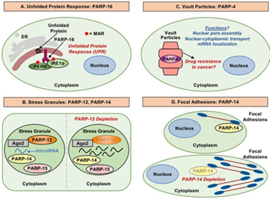 Biological processes regulated by cytosolic MARTs. (A) PARP-16 regulates the unfolded protein response (UPR) by modulating the activity of PERK and IRE1α through MARylation. (B) PARP-12, PARP-14, and PARP-15 are components of stress granules. PARP-12 associates with Ago2; upon PARP-12 depletion, microRNA levels increase. (C) PARP-4 is a component of vault particles, which are thought to play important roles in drug resistance in cancers. (D) PARP-14 is a component of focal adhesion complexes and is required for proper focal adhesion function and disassembly, as well as cell motility.
