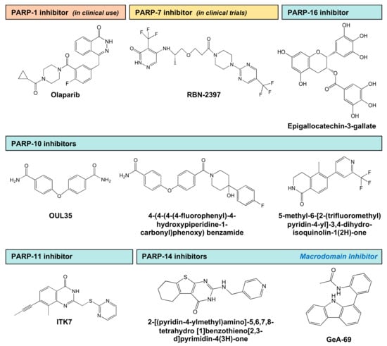 Chemical structures of PARP and MART inhibitors. The structure of the PARP-1 inhibitor, Olaparib, the first FDA-approved PARP inhibitor, is shown for comparison. The PARP-7 inhibitor, RBN-2397, is in Phase I clinical trials (ClinicalTrials.gov identifier: NCT04053673). All of the inhibitors shown target the catalytic domain of the PARPs, except the PARP-14 inhibitor GeA-69, which targets the macrodomains. See also Table 2.
