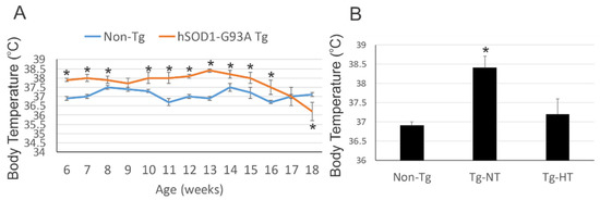 Body temperatures of age-matched male hSOD1-G93A tg mice and male non-tg littermates were measured beginning at 6 weeks of age through terminal disease. At 6 weeks of age, hSOD1-G93A tg mice were significantly (p < 0.05) higher at 38 °C compared to non-tg controls at 37 °C (Figure 1A). There was scant major fluctuation until end-stage disease for the hSOD1-G93A tg mice when they dropped significantly (p < 0.05) to near 36 °C (Figure 1A).
