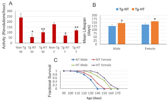 At 10 weeks of age, male and female hSOD1-G93A tg mice housed at ambient temperature (Figure 2A, Tg-NT) had a significant (p < 0.001) reduction of motor activity compared to sex-matched non-tg littermates (Figure 2A, Non-Tg NT). Cold acclimated male hSOD1-G93A tg mice (Figure 2A, Tg-HT M) and female hSOD1-G93A tg mice (Figure 2A, Tg-HT F) showed significantly (p < 0.05) improved motor activity compared to hSOD1-G93A tg mice maintained at normothermic temperature (Figure 2A, Tg-NT); however, all hSOD1-G93A tg groups had significant (p < 0.01) motor deficits compared to age-matched non-tg mice (Figure 2A). The mean lifespans of cold acclimated male hSOD1-G93A tg mice were increased significantly (p < 0.01) compared to sex-matched normothermic hSOD1-G93A tg mice (Figure 2B). Overall survival of cold acclimated male hSOD1-G93A tg mice was increased significantly compared to male normothermic hSOD1-G93A tg mice (Figure 2C, log rank p = 0.04, HT-male versus NT-male). Cold acclimation of female hSOD1-G93A tg mice caused a slightly stronger effect on significantly increasing lifespan compared to female normothermic hSOD1-G93A tg mice (Figure 2C, log rank p = 0.03, HT-female versus NT-female).