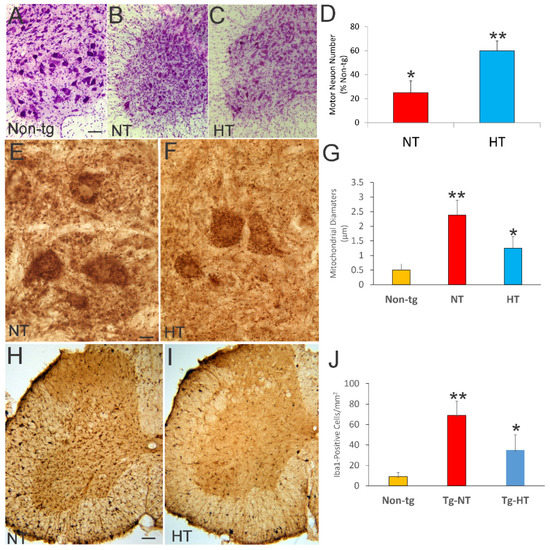 Nissl-stained transverse sections of the lumbar spinal cord were used to count the number of motor neurons (MNs) in NT and HT treated hSOD1-G93A tg mice and in age-matched littermate non-tg mice. Spinal cord sections were selected with a random start and then systematically sampled (every 10th section) to generate a subsample of sections from each mouse L3–L5 spinal cord that was mounted on glass slides and stained with cresyl violet for cell counting. Nissl-stained MNs in the ventral horn were counted by individuals blinded to the experimental treatment, using strict morphological criteria, in digital images acquired with a Nikon microscope at 200× magnification. These criteria included a round, open, pale nucleus (not condensed and darkly stained), globular Nissl staining of the cytoplasm, and a diameter of 20–40 μm. With these criteria, astrocytes, oligodendrocytes, and microglia were excluded from the counts, but these counts are likely to estimate the combined populations of α- and γ-MNs. Inter-rater reliability was assessed (K = 0.9).