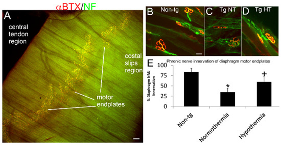Cold acclimation preserves diaphragm NMJ integrity in hSOD1-G93A tg mice. (A) Low magnification image showing the band distribution of NMJs (yellow) in a mouse hemidiaphragm. Scale bar = 320 µm. (B–D) Innervation of diaphragm motor endplates (visualized by Alexa 594-conjugated α-bungarotoxin, αBTX, red) by motor neuron axons (visualized by immunofluorescence for neurofilament, NF, green) in a non-tg mouse (B) and in hSOD1-G93A tg mice that were ambient normothermic (C, Tg NT) and cold acclimated hypothermic (D, Tg HT) at 12 weeks of age. Scale bar (in B, same for C,D) = 19 µm. (E) Counts of innervated motor endplates in a diaphragm of non-tg mice and hSOD1-G93A tg mice that were ambient normothermic or cold acclimated hypothermic showed significant loss (* p < 0.01) of innervation in normothermia hSOD1-G93A tg mice and rescue (+ p < 0.05) of innervation in cold acclimated hypothermia hSOD1-G93A tg mice.