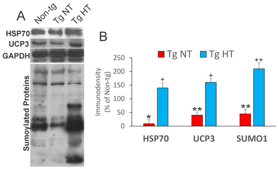 Whole-body cooling induced changes in cytoprotective proteins in the skeletal muscle of hSOD1-G93A tg mice at 12 weeks of age. (A) Representative Western blots for heat shock protein 70 (HSP70), uncoupling protein 3 (UCP3), and protein sumoylation (SUMO1) in hindleg muscle of non-tg mice (non-tg) and hSOD1-G93A tg mice that were cooled (Tg HT) or not cooled (Tg NT). GAPDH was used as a protein loading control. (B) Graph of quantitative analysis of target protein immunodensities. In NT hSOD1-G93A tg mice, HSP70 (* p < 0.001), UCP3 (** p < 0.01), and SUMO1 conjugated proteins (** p < 0.01) were significantly reduced compared to non-tg mice. In HT hSOD1-G93A tg mice, the levels of immunoreactivity for HSP70, UCP3, and SUMO-conjugated proteins were restored to non-tg levels or significantly exceeded non-tg levels (+ p < 0.05, ++ p < 0.01).