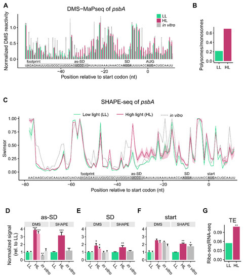 For the translation initiation region of psbA, we observed good reproducibility of SHAPE reactivities among replicates (Figure 1C). The Shine-Dalgarno sequence, start codon, and the sequence that can potentially bind the Shine-Dalgarno sequence (as-SD) showed higher SHAPE reactivity in high light samples than in low light controls (Figure 1C–F). The SHAPE reactivities correlate with the DMS-MaP signal observed in the translation initiation region, especially with the more reliable DMS probing of adenosines and cytidines in the region from the as-SD to the start codon (Figure S10). Thus, using two different chemical probes, we find that the psbA translation initiation region becomes more accessible under high light conditions (Figure 1A,C,E,F, Supplemental Figure S10). The effect correlates well with increased psbA translation (Figure 1B,G) and is observed after both short-term high light stress in young plants and long-term high light acclimation of young leaves of seven-week-old plants.