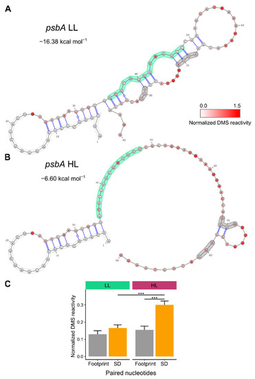 Footprint of a putative regulatory protein bound to the 5′ UTR of psbA: (A) Predicted mRNA secondary structure of the psbA translation initiation region in low light (LL) using normalized DMS reactivities (Figure 1A) as constrains. The white box marks the position of the primer used to amplify the cDNA. For this region no DMS reactivities could be obtained. The green box marks the footprint of a RNA binding protein [36] (Supplemental Figure S11A–D), the grey boxes indicate the Shine-Dalgarno sequence (AGGA) and the start codon (AUG). For each nucleotide, the normalized DMS reactivity is shown in a color code. The kcal mol−1 value for the strength of the RNA structure is given. (B) Predicted mRNA secondary structure in high light (HL) using normalized DMS reactivities (Figure 1A) and the protein binding site (forced to be single-stranded) as constrains. For the structure predictions for in vitro-folded RNA see Supplemental Figure S11G. (C) Normalized DMS reactivities of the nucleotides predicted to form base pairs in low light (A) between the region of the footprint (between nucleotides 35–48) and the region including the start codon and the Shine-Dalgarno sequence (SD) (between nucleotides 69–86). The average normalized DMS reactivities are shown separately for both regions. Nucleotides in these regions predicted not to be paired are excluded. There is no significant difference between low light and high light for the low DMS reactivities at the footprint side, which can indicate both double-stranded RNA and a bound protein. In contrast, the DMS reactivities at the SD side significantly increase in high light indicating a shift to single-stranded RNA. This suggests that in low light a stem loop structure is formed (A), whereas in high light a protein is bound to the psbA translation initiation region making the SD and the start codon accessible (B). Asterisks indicate statistically significant changes (p-values calculated with the Wilcoxon rank sum test; *** = p < 0.001), error bars indicate mean standard error. For the separately analyzed DMS reactivities at adenosines and cytidines as well as SHAPE reactivities see Supplemental Figure S11E,F.