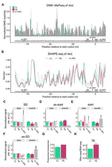 mRNA secondary structure changes in the translation initiation region of rbcL: (A) DMS probing of RNA from young, 17–18-days-old plants exposed to low light (LL, light green), high light (HL, dark red), and of in vitro-folded RNA (gray). Normalized DMS reactivities are shown (compare Figure 1). The error bars indicate the mean standard error. The start codon (start), Shine-Dalgarno sequence (SD), and sequences that can bind the start codon (as-start) and the SD (as-SD1 and as-SD2) are marked. One portion of the SD can bind to a sequence in the coding region (as-SD2), the other one to a sequence upstream in the 5′ UTR (as-SD1). A comparison of the DMS-probed RNA with a water-treated control is shown in Supplemental Figure S4B. (B) SHAPE analysis (NAI-N3 probing) of RNA from young leaf tissue obtained from seven-week-old plants presented as swinsor normalized termination counts. The shaded areas around the lines indicate the mean standard error. Positions −9 and −7 were not analyzed, because for at least one of the LL or HL samples the swinsor value was missing. (C) Average incidence of structure at the Shine-Dalgarno sequence (SD) as shown by DMS and SHAPE values normalized to the low light values. The darker colored columns represent the more reliable reactivities at adenosines/cytidines, the columns in lighter colors are the reactivities at all four nucleotides. Asterisks here (and in (D–F)) indicate statistically significant changes compared to LL (p-values calculated with the Wilcoxon rank sum test; * = p < 0.05, ** = p < 0.01, and *** = p < 0.001), error bars indicate mean standard error. (D) Average mRNA secondary structure at the nucleotide binding the start codon (as-start). (E) Average structure at the start codon (start). (F) Average structure at the sequences binding the SD (as-SD1 and as-SD2). (G) Change in translation in 17–18-days-old plants (polysome fractions/monosome fractions, Figure S1). (H) Change in translation efficiency (ratio footprints/transcript levels, Figure 4) in young leaves of seven-week-old plants. Asterisks indicate statistically significant changes compared to LL (calculated with RiboDiff; *** = p < 0.001).