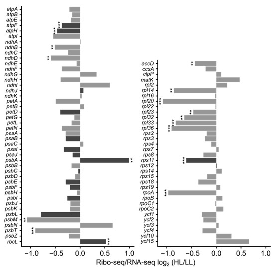 Changes in translation efficiency in response to high light treatment: The translation efficiencies (Ribo-seq/RNA-seq) for all plastid-encoded genes are shown as ratios of the high light (HL) to the low light (LL) scores, expressed as log2 values. Young leaves of seven-week-old plants were analyzed (as in Figure 1C and Figure 3B). The left panel lists the genes coding for subunits of the photosynthetic complexes, the right panel shows the data for all other genes. Translation efficiency was determined from normalized read counts for the ribosomal footprints divided by those for the transcripts of each coding region (Figure S13). Asterisks indicate statistically significant changes (calculated with RiboDiff; ** = p < 0.01 and *** = p < 0.001). Genes with bars in darker gray had sufficient coverage to permit the analysis of mRNA secondary structure (Figure 1, Figure 3 and Figure 5).