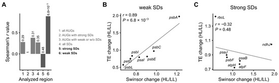 Correlations between changes in mRNA secondary structure and translation efficiency: The changes in mRNA secondary structure are calculated from the swinsor-normalized termination count values derived from NAI-N3 probing by dividing the values from the high light exposed plants by those from the low light control plants (young leaves of seven-week-old plants). An increase of the swinsor value indicates a decrease in base pairing, i.e., less RNA secondary structure. Average changes for the indicated segments of each gene are given. The change in translation efficiency is calculated by dividing the normalized read counts for the ribosomal footprints by those for the transcripts of each coding region, and then dividing the resulting values from the high light treatment by those from the low light control. Only genes with sufficient coverage of the mRNA secondary structure (on average at least 10 reverse transcription stops per nucleotide) are included. Spearman’s r and p values are given. (A) Overview including all analyzed correlations. Columns 1–6 show Spearman’s r for the correlation between the change in translation efficiency and the change in SHAPE reactivities for different gene regions. The corresponding p values are given above the respective column. (1) start codons (AUG); (2) start codons of genes with strong Shine-Dalgarno sequences (SDs) (hybridization to the anti-SD of the 16S rRNA <−9 kcal mol−1); (3) start codons of genes with weak or no SD (>−6 kcal mol−1); (4) SDs; (5) SDs of genes with strong SD (<−9 kcal mol−1); and (6) SDs of genes with weak SD (>−6 kcal mol−1). The plots for all these analyses can be found in Supplemental Figure S15, where also an analysis of additional regions is included (see also Supplemental Figure S16). The plots for the highlighted correlations (5) and (6) are shown in (B) (change of structure at the SDs of genes with strong SD) and (C) (SDs of genes with weak SD).
