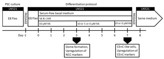 In comparison to previous publications, the clear difference in our protocol compared to the others is that we only used RA in addition to SB and CHIR, with relatively fast differentiation of the CEnC-like cells. Several other groups used the B27, PDGF-BB, DKK-2 cocktail discovered by McCabe et al. [19] to further differentiate CEnCs from NCCs [19,20,41]. Replacing this cocktail with early RA induction seemed to produce CEnC-like cells with very short induction times needed. Nevertheless, the optimal RA concentration in later stages of the CEn maturation is still to be discovered, together with the further development and in vivo functional assessment of hPSC-CEnCs.