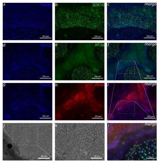 NCC induction resulted in three distinct cell populations. After 14 days of NCC induction, three distinct cell populations were discovered: (a–c) cells expressing SOX10, (d–f) activating enhancer binding protein 2 alpha (AP2α) and (g–i) paired box protein 6 (PAX6). (l) AP2α and PAX6 images are merged and enlarged 3× to highlight distinct populations between PAX6 and AP2α-positive cells. (j,k) Phase contrast light microscope images show the polygonal morphology of the monolayered AP2α-positive cells. Data conducted with the Regea08/017 human embryonic stem cell (hESC) line. Scale bars: (a–j) 200 µm, (k) 100 µm and (l) 50 µm.