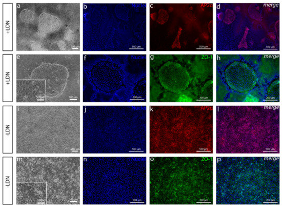 Comparison of cell cultures with or without BMP inhibition. (a,e–p) After 8 days and (b–d) 13 days of differentiation, (a,e), phase contrast microscope images and (b–d,f–h) immunofluorescence images of cell cultures with pathway inhibitor LDN193189 (LDN) show (b–d) the AP2α-positive polygonal cell colonies where (f–h) zona occludens-1 (ZO-1) is localized in tight junctions surrounded by a thick cell mass. (i–p) Cell cultures without LDN show that (i,m) the thick cell mass is absent, and (j–l) AP2α is positive for all the cells. (n–p) ZO-1 is in tight junctions as well, but the cells are less polygonal. Data conducted with the Regea08/017 hESC line. Scale bars: (a,f–i,n–p) 200 µm, (b–d,j–l) 500 µm, (e,m) 100 µm and (e,m magnified images) 50 µm.