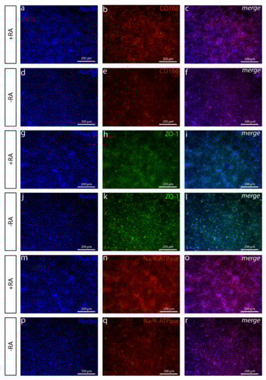 Immunofluorescence images of common CEnC markers with or without RA shown for the Regea08/017 hESC line. After day 11 of differentiation, (a–f) CD166 is substantially stronger when (a–c) RA is used (+RA) in the induction compared to when (d–f) RA is absent (−RA). (g–l) Tight junction marker ZO-1 shows more polygonal and tightly packed cells (g–i) with +RA compared to the cell culture (j–l) without −RA. (m–r) Na+/K+-ATPase is important for the pump activity, and the expression was higher in (m–o) the cell culture with RA compared to (p–r) the cell culture without RA. Scale bar (a–r) 200 µm. Corresponding human induced pluripotent stem cell (hiPSC) data is shown in Figure S5.