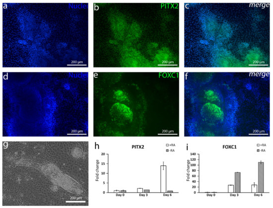 Expression of common periocular mesenchyme (POM) markers in the differentiated cell culture. After 11 days of differentiation, (a–c) the paired-like homeodomain transcription factor 2 (PITX2) expression is stronger in the thick mesenchyme-like structures. (d–f) Forkhead box C1 (FOXC1) can be seen in the same structures as well. (g) POM-like structures are surrounded by CEnC-like cells. (h) RT-qPCR analyses of the differentiating cells with or without retinoic acid (RA) shows an increasing expression of PITX2, especially in +RA but not in −RA. (i) The FOXC1 expression increases in both circumstances but more in −RA. Data conducted with the Regea08/017 hESC line. RT-qPCR analyses included three technical replicates. Scale bar (a–g) 200 µm.