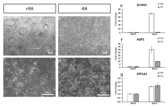 Dome formation was observed already at day 3 of the differentiation. (a) White arrows point to the dome structures in the cell culture with RA at day 3. (b) Domes are not present in cultures without RA. (c) Cells are more polygonal in cell culture with RA at day 10 (RA lowered to 5 µM for days 3–6 and 0 µM after day 6) compared to (d) cell culture without RA. Expression of RT-qPCR markers of pump-related genes are increased during the differentiation. (e) Strong increase can be seen in the expression of sodium bicarbonate cotransporter 1 (SLC4A4) in +RA but not in the −RA. (f) Expression of water channel aquaporin 1 (AQP1) is increased in both +RA and −RA but faster in +RA. (g) The increase in the expression of pump protein ATPase subunit alpha 1 (ATP1A1) is moderate. Data conducted with (a,b) the WT001.TAU.bB2 hiPSC line and (c–g) Regea08/017 hESC line. RT-qPCR analyses included three technical replicates. Scale bar (a–d) 200 µm.
